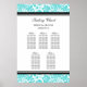 Elegant and contemporary customisable five table seating chart for wedding in modern turquoise teal blue, black and white classic floral damask vintage pattern. Customise with your guests name to make a unique seating chart for your wedding. Contact us for a custom chart for a different number of guests.