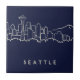 This design features a hand drawn sketch of the Seattle skyline on a dark blue background.