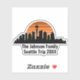 Cool customised Seattle trip laptop sticker featuring the city skyline at sunset. A silhouette of the city buildings in Washington, including the space needle above your personalised text for your family vacation.