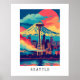 Colorful poster of Seattle featuring the iconic Space Needle, Mount Rainier, and a vibrant sunset sky reflected over the water.