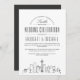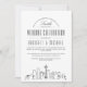It features a modern deco-style illustration of the city's skyline resting towards the bottom. Centred above this are the names of the wedding couple and your wedding day information in matching open-lined style text. The text elements of this are framed by an arched line border enveloping it. This is all together presented in a neutral black and white, classy theme.