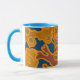 White mug with blue handle and rim, decorated with a screenprinted seaweed design.