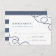 Elegant coastal wedding RSVP card features your desired response date and custom accept/decline wording in slate blue grey on a white background, accented at the corners with loops of braided nautical rope. Cards reverse to wide nautical stripes.