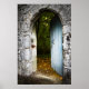A portrait orientated image depicting a stone wall that is centuries old with a aged blue gate. The gate lies ajar revealing a glimpse of the lush garden and leafy undergrowth behind.