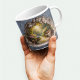 Photo Collage Mugs through a magical portal into a serene garden escape. This enchanting design features a charming stone pathway leading to a cozy wooden bench, adorned with soft blankets. Dazzling fairy lights twinkle above, casting a warm glow on the abundant, colorful flowers and lush greenery. It's a perfect depiction of a secret garden, offering a tranquil retreat for your everyday moments. Imagine sipping your morning coffee or evening tea while being transported to this idyllic scene.