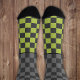 This first design keeps it cool — at least on the surface. Up on the calf: subtle checks in grey on dark grey. But down below, on the foot? The same pattern comes to life in bold lime green. A quiet top, a wild sole. It’s a perfect symbol of duality: what the world sees, and who you really are.