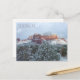 Scenic Snowy Winter View of Sedona, AZ postcard. Beautiful scenery on this lovely nature photograph includes the red rock mountains and buttes covered in a layer of snow. The background shows a cloudy grey winter sky while the foreground is filled with trees with a dusting of snow.