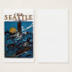 A vintage poster promoting travel to Seattle, Washington during the year 1915. Handsome view of Seattle's port and architecture as seen at night with a full moon rising in the background.