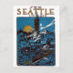 A vintage poster promoting travel to Seattle, Washington during the year 1915. Handsome view of Seattle's port and architecture as seen at night with a full moon rising in the background.