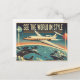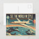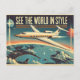 ✅ Here’s the vintage travel postcard featuring a stylised jet soaring through the sky with elegant, streamlined wings and a golden stripe. ✈️🌏✨ The background showcases a view of Earth with blue oceans, scattered clouds, and glowing city lights. The bold, elegant 1950s-style typography reads "See the World in Style", giving it a nostalgic, aviation-inspired vibe