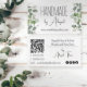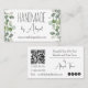 Seeded Eucalyptus Handmade | Handcrafted Business Card -- Features seeded eucalyptus left and right borders on the front of the card, along with your business name and website address. On back is a customisable QR Code for web address of your choosing, your tag line on the top right with a line and your name below. The bottom left features optional template fields for your office and cell phone numbers as well as your email address. The bottom right features a variety of social media icons--you can use these for this purpose, swap them for icons of your choosing or delete them altogether. All colours, text and backgrounds are editable except for eucalyptus artwork.