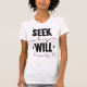 This stylish and spiritually focused apparel design features the directive from scripture, "SEEK his WILL", referencing Proverbs 3:6. The message emphasizes trust in God and dedication to finding and following His path. The text is rendered in high-contrast black typography against a clean white T-shirt background. The design utilizes a compelling mix of fonts: large, bold, modern print for the emphasized words "SEEK" and "WILL," and flowing script for the smaller words ("his") and the verse reference. The phrase is accented by decorative heart graphics and flourishes, symbolizing the need to seek His will with all your heart. This versatile T-shirt is a strong, public declaration of faith, guidance, and spiritual devotion. It is ideal for casual wear, Bible study groups, or as a thoughtful, meaningful gift for anyone focused on walking in their faith.