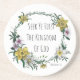 An original colored floral design by Cora Worthington featuring daffodils, cherry blossoms, and the verse Matthew 6:33, this coaster serves as a reminder to Christians that when life is hard and we aren't sure what to do, we can seek the kingdom of God and trust that all we need will be provided to us.