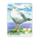 A magnet decorated with a ring billed seagull standing on the grassy shore of a lake with a Sego Lily flower accent inspired by the State Bird and State Flower of Utah illustrated with pen and ink and painted with watercolor.