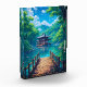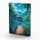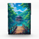 Step into a world of breathtaking tranquillity with this vibrant, anime-inspired Japanese landscape art print. This stunning piece captures a picturesque wooden pagoda nestled over a sparkling, azure lake, surrounded by a lush, emerald forest.
