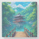 Step into a world of breathtaking tranquillity with this vibrant, anime-inspired Japanese landscape art print. This stunning piece captures a picturesque wooden pagoda nestled over a sparkling, azure lake, surrounded by a lush, emerald forest.