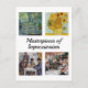 Various impressionist masterpieces: Paul Cezanne - The Card Players, Pierre-Auguste Renoir - Luncheon of Boating Party, Vincent Van Gogh - Vase with Fifteen Sunflowers, Claude Monet - Water Lily pond, Green Harmony