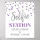 Selfie station sign poster for baby shower, bridal shower, or wedding in white, dark purple and silver glitter confetti pattern with handwritten style lettering. Perfect for a baby shower, wedding, or bridal shower.