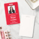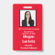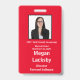 Seminar Attendee badge in Red and White. All elements can be changed, including: photo, seminar name, seminar location & date, attendee's name, attendee's title and the name of the company.Also available in horizontal orientation in this store. Slot at top for lanyard.