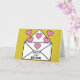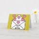 Cute "birthday Card" featuring an open white envelope with pink love hearts flying out of it on a mustard yellow background. Written on the envelope are the words "Sending Love on you birthday". Inside is a template to add your own personalised birthday wish.