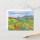 Sending love from the mountains thinking of you greeting card decorated with a desert vista in spring with bright yellow and purple wildflowers along the layers of hills leading to the indigo peaks in the distance hand painted with watercolor.