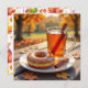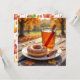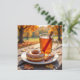 A pretty Fall card to send someone Autumn Blessings. A pretty illustration of plate of a glazed doughnut, apple cider with cinnamon stickrs and a pretty Fall leaves background.