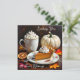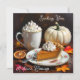 Pretty Fall themed greeting card saying, "Sending you Autumn Blessings" for a friend or family member. An ai illustration of a yummy Autumn scene with a piece of pumpkin pie and whipped cream on a fancy vintage plate, a mug of hot cocoa with whipped cream and a white pumpkin surrounded by cinnamon sticks and dried orange slices.