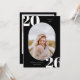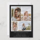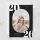 Rounded photo frame, senior class graduation announcement and invitation. Black backgrounds and white typography with template lines for year, graduate's name and school. Back of card features 4 additional photo spaces with text lines for your open house/graduation party details.