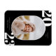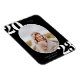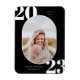 Rounded photo frame, senior class graduation announcement magnet. Classic black background and white typography with template lines for class of year, graduate's name and school.
