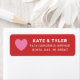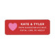 Simply stylish wedding return address labels feature a red background, custom white text that can be personalised, accented with a pink heart shape. The colours and fonts can be completely personalised.