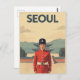 Experience the traditional majesty of Seoul, South Korea, with this striking vintage travel poster style postcard. The design features a solemn figure dressed in a bright red guard uniform and a black hat, reminiscent of the royal guards, standing before a beautiful traditional Korean palace gate (like Gyeongbokgung). The serene mountains and classic architecture create a powerful contrast with the military figure. This postcard is perfect for sending greetings from Korea, decorating with unique retro Asian art, or adding a distinguished piece to your travel collection.