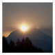 A photograph of the morning sun rising above the crest of Mount Rainier's mountain top.