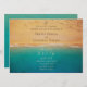 Birdseye view of a sandy beach and a teal-blue ocean, horizontal invitation.