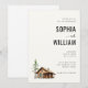 This elegant wedding invitation features a serene and inviting design with a vertical layout, showcasing a rustic log cabin illustration beside an evergreen tree. The color palette is composed of soft earthy tones on a light beige background, creating a classic and understated look. Serif fonts are used for the text, providing a sophisticated touch while allowing customization for names, dates, and locations. The overall mood is calm and welcoming, perfect for celebrating an intimate gathering in a natural setting.