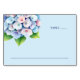 This wedding place card features a charming cluster of hydrangea flowers in soft pastel hues, including pale pink, lavender, and sky blue, set against a light blue background. The design showcases an asymmetrical layout with the floral arrangement on the left, leaving ample space for customisation on the right. The elegant serif font adds a touch of sophistication, while the minimalist aesthetic creates a serene and inviting atmosphere perfect for weddings or formal events. The contemporary botanical theme emphasizes natural beauty with clean lines and uncluttered spacing, making it ideal for creating a peaceful ambiance at your special occasion.