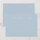 This wedding enclosure card features a minimalist design with a soft pastel blue background, creating a serene and sophisticated atmosphere. The layout is clean and organised, with elegant script typography for the title "The Details" and easy-to-read sans-serif text below, guiding guests to visit a customisable website for more information. The generous use of negative space enhances readability and adds to the modern aesthetic, making it perfect for formal occasions. Its understated elegance ensures that it complements any wedding theme while maintaining a polished look.