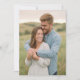 This wedding invitation features a tender moment between a couple embracing in an outdoor setting, capturing the essence of love and unity. The design showcases a soft colour palette with earthy greens from the grassy fields and muted blues from the sky, complemented by the delicate pastel floral pattern on the woman's dress. The photographic style creates a realistic yet dreamy atmosphere, emphasizing the rustic and natural theme. The composition focuses on the emotional connection between the two figures, set against a serene backdrop that evokes joy and tranquillity, making it perfect for couples seeking an intimate and heartfelt celebration.