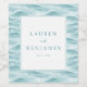 This elegant wedding wine label features a serene ocean wave design in soft blues and whites, creating a tranquil seaside theme. The minimalist layout centers on clean, modern typography that highlights the names and date, making it perfect for personalization. The abstract waves add visual interest without overwhelming the simple yet sophisticated aesthetic, ideal for celebrating your special day with a touch of calm elegance.