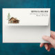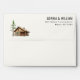 This wedding envelope features a charming rustic design with a hand-drawn log cabin and evergreen tree, evoking a serene countryside theme. The color palette includes natural wood tones and various greens, creating a cozy and inviting atmosphere. The layout is balanced, with the illustration on the left and elegant serif typography for names and addresses on the right, offering a customizable touch. Perfect for couples who appreciate nature and simplicity, this design captures the warmth of a cabin retreat in a stylish and personalized way.
