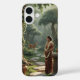 Bring poetic beauty to your everyday essentials with this serene iPhone case design inspired by South Indian forest landscapes and timeless village traditions. The artwork features flowering jasmine vines wrapped around majestic banyan trees, quiet forest paths with river stones, and gentle deer grazing beneath soft dappled sunlight. A graceful tribal woman in traditional attire stands near a carved stone well, holding a fragrant garland — a symbol of love’s patience and peace.