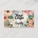 Delight your customers with this elegant floral loyalty card, featuring a serene watercolor background in smokey blue and soft grey-yellow. A delicate wreath of greenery, pink roses, and peach daisies encircles the word “Loyalty” in a graceful designer font. The front also includes space for your logo. On the back, add your custom reward offer, six punch or stamp circles, and contact info. Ideal for boutiques, florists, or spa businesses wanting a soft, feminine touch.