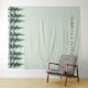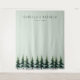 This wedding backdrop features a serene and minimalist design with a soft, pale green background that creates a calming atmosphere. The lower section is adorned with stylised evergreen trees in varying shades of green, adding a touch of nature to the composition. Customisable text at the top allows for personalisation with names and dates, set in a clean, modern sans-serif font. The overall style is contemporary and elegant, perfect for creating a tranquil and sophisticated ambiance at your special event.