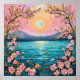 In the foreground, blossoming cherry trees with delicate pink flowers frame the image, their branches curling gracefully. The water below mirrors the colours of the sky, reflecting the tranquil mood, while golden accents, possibly depicting sunlight, add a touch of warmth and brightness. Overall, the image evokes a sense of peace and natural beauty.