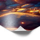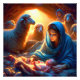 The image depicts a serene and evocative Nativity scene. A woman with a gentle expression, cloaked in a soft blue garment, is gazing affectionately at a newborn child lying on a blanket in front of her. The child's skin glows with a soft light, adding to the peaceful and almost mystical atmosphere of the scene. Surrounding them are several sheep with a calm and protective demeanour. In the background, we see a small figure that seems to be watching over the scene, adding a sense of depth and narrative to the image. The warm lighting, predominantly in golden hues, suggests the event is taking place in an intimate, sheltered environment, possibly a cave or stable, which is further emphasized by the rocky textures around them. The overall composition, colour palette, and lighting create a feeling of warmth, tenderness, and reverence. This poster would likely appeal to those interested in religious art, themes of new life, or tranquil pastoral scenes.