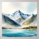 This tranquil watercolor landscape features snow-capped peaks reflected in crystal blue waters, evoking peaceful alpine beauty. Ideal for creating a calming atmosphere in your home, office, or meditation space.