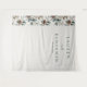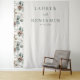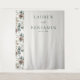 This elegant wedding backdrop features a vertical layout with a balanced composition, showcasing a repeating pattern of botanical illustrations on the left side. The design includes stylised leaves and pinecones in muted earthy tones of green and beige, creating a natural and organic feel. On the right side, ample negative space contrasts beautifully with the intricate pattern, while classic serif typography adds a touch of sophistication. Perfect for a serene and inviting wedding ceremony, this backdrop captures timeless refinement and celebrates the beauty of nature.