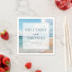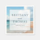 This wedding napkin features a serene beach scene with gentle waves and a sandy shore under a partly cloudy sky, rendered in soft pastel blues, whites, and beige tones. The watercolor art technique gives the design a dreamy, ethereal quality, creating a romantic and tranquil mood perfect for celebrating love. Central to the design is a white square overlay with elegant typography, offering customizable space for names and dates, ensuring it's both functional and stylish for your special day.