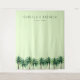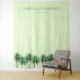 This wedding backdrop features a minimalist design with a soft pastel green background, creating a serene and inviting atmosphere. The layout includes customisable text at the top in a clean, sans-serif font, followed by a row of stylised palm trees at the bottom, adding a tropical touch. The colour palette is harmonious, using varying shades of green to evoke tranquillity and natural beauty. Perfect for a beach or garden-themed wedding, this design combines simplicity and elegance, making it an ideal choice for couples looking to celebrate their special day in style.