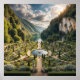 This stunning landscape features an immaculately designed formal garden with symmetrical pathways, lush topiary, and a central fountain. Beyond lies a serene lake surrounded by verdant forests and towering cliffs. The interplay of sunlight and clouds creates a magical atmosphere, inviting viewers to lose themselves in this idyllic scene