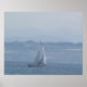 A sailboat glides across a calm ocean, with distant mountains and a hazy horizon in the background. Mainly blue